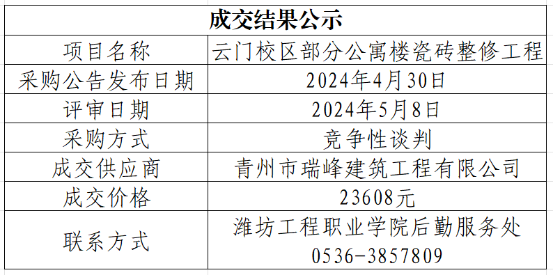 云门校区部分公寓楼瓷砖整修工程成交结果公示